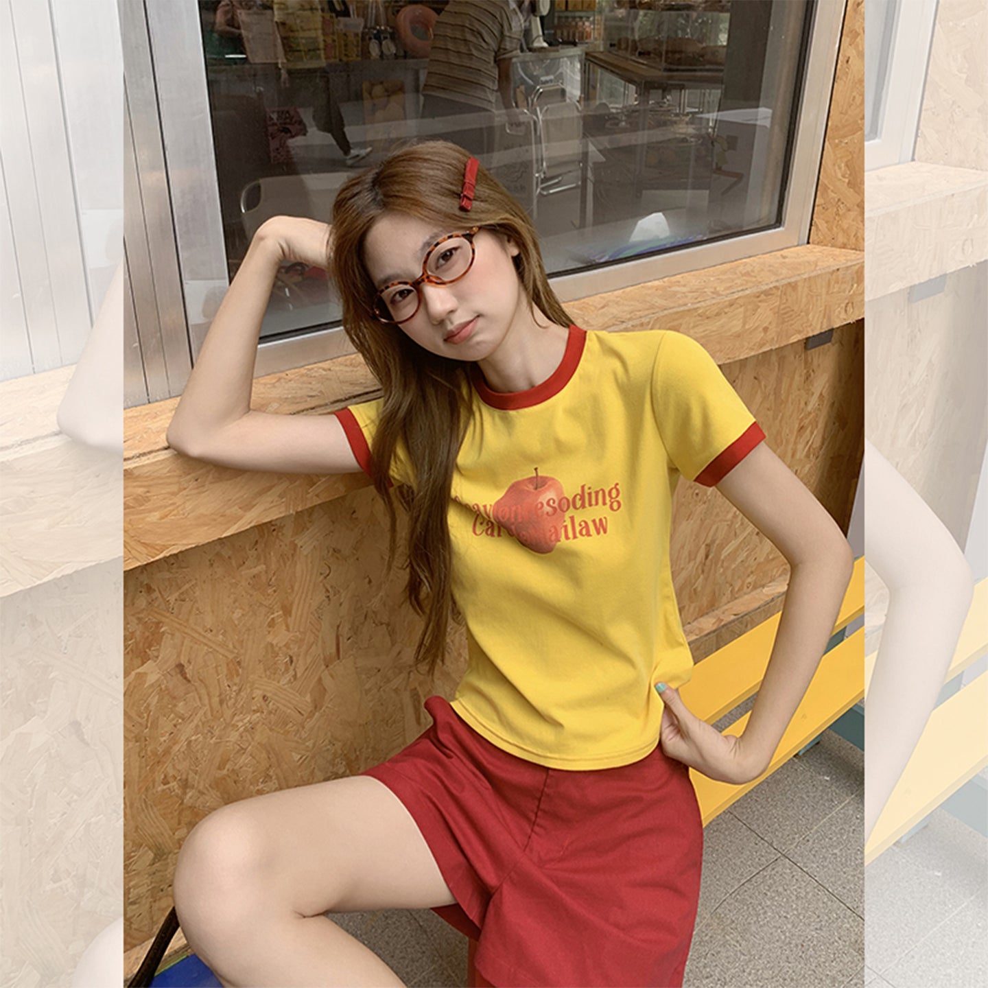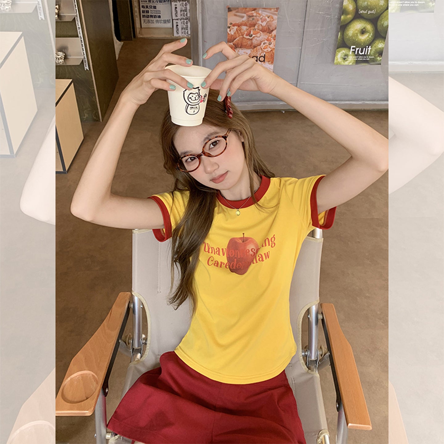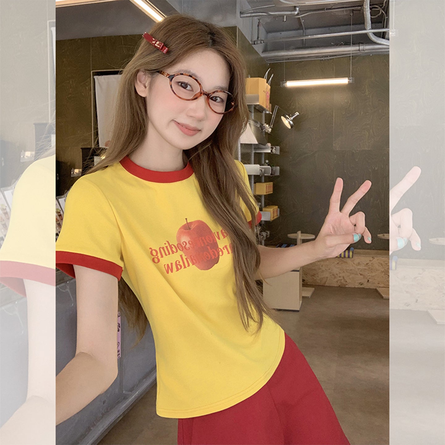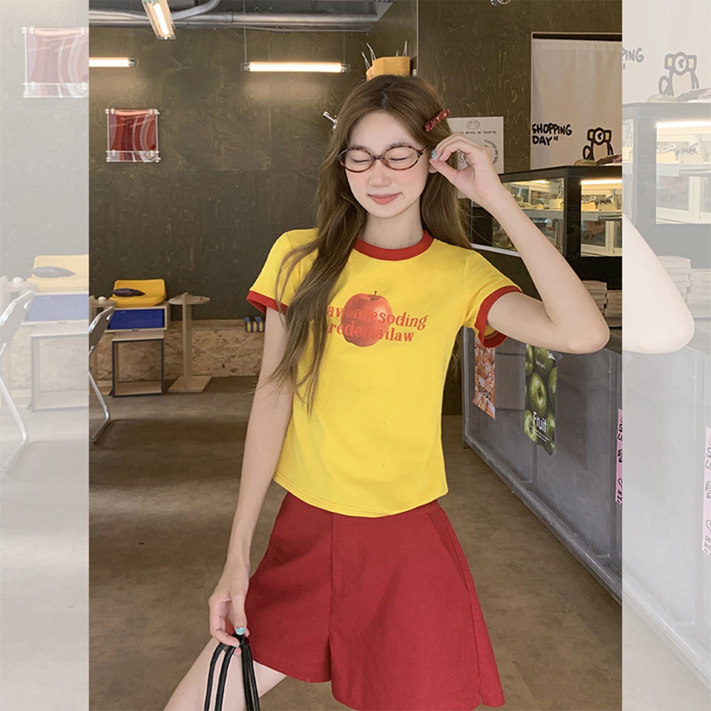 Fanciti Women's Top Apple Printed Color Block